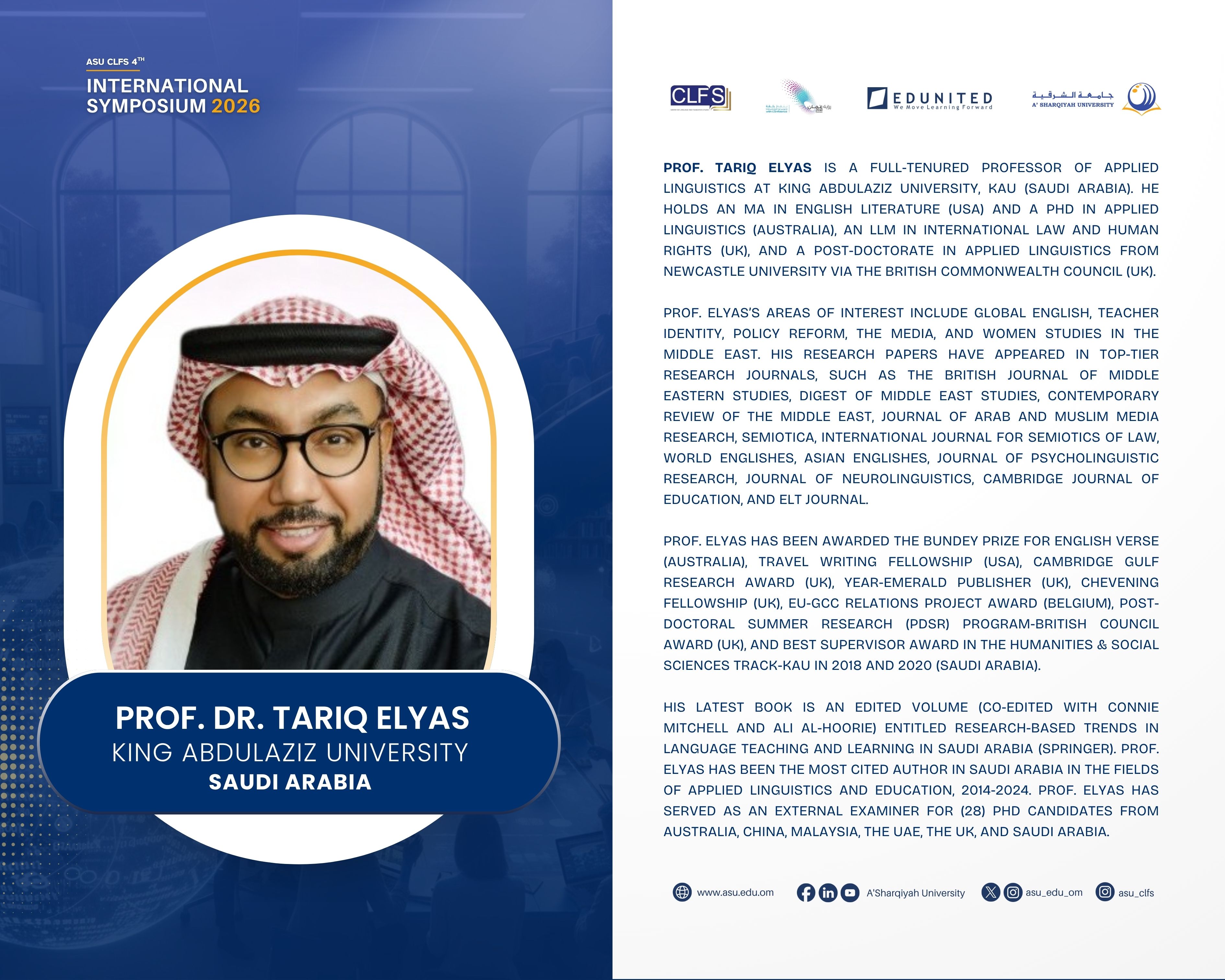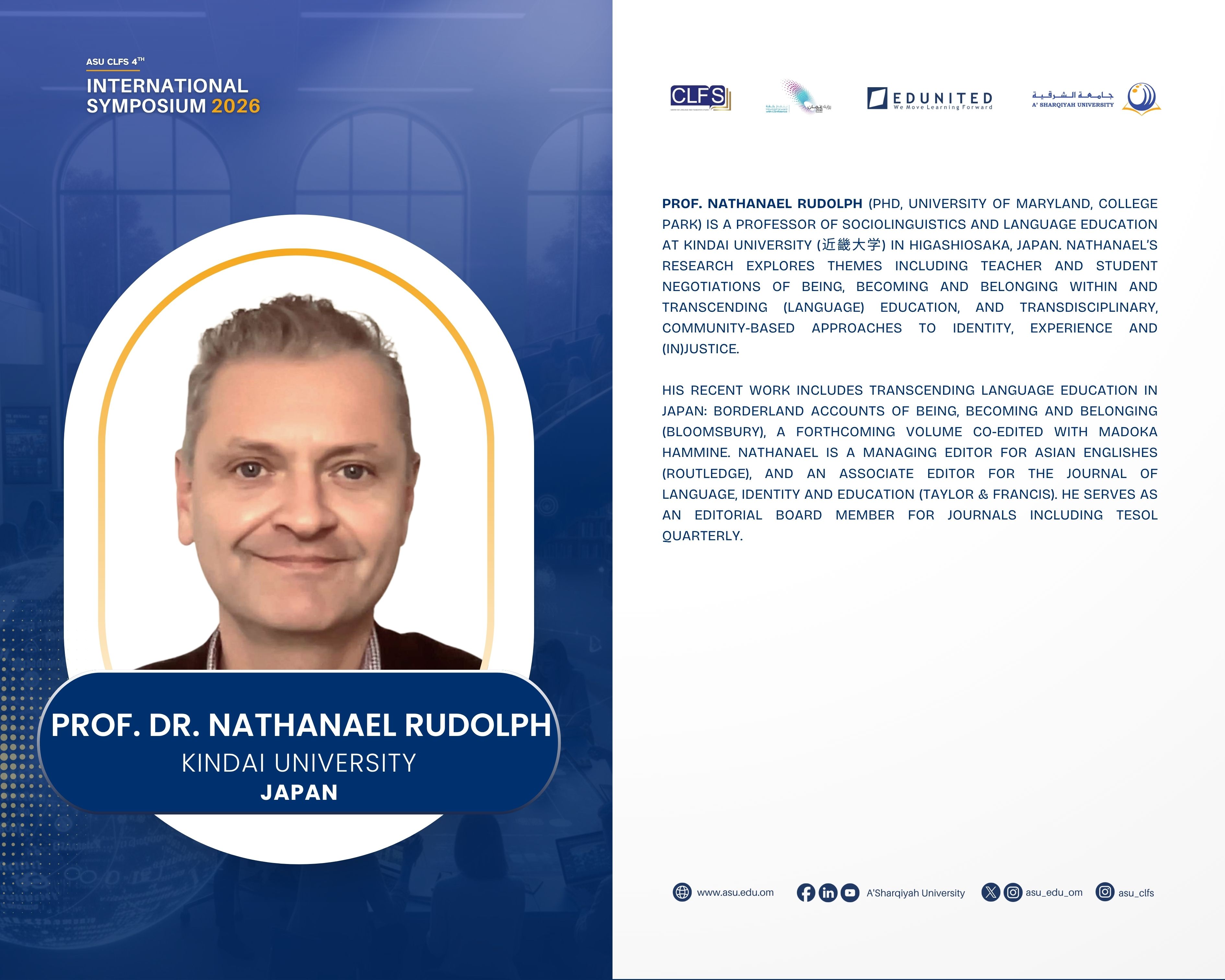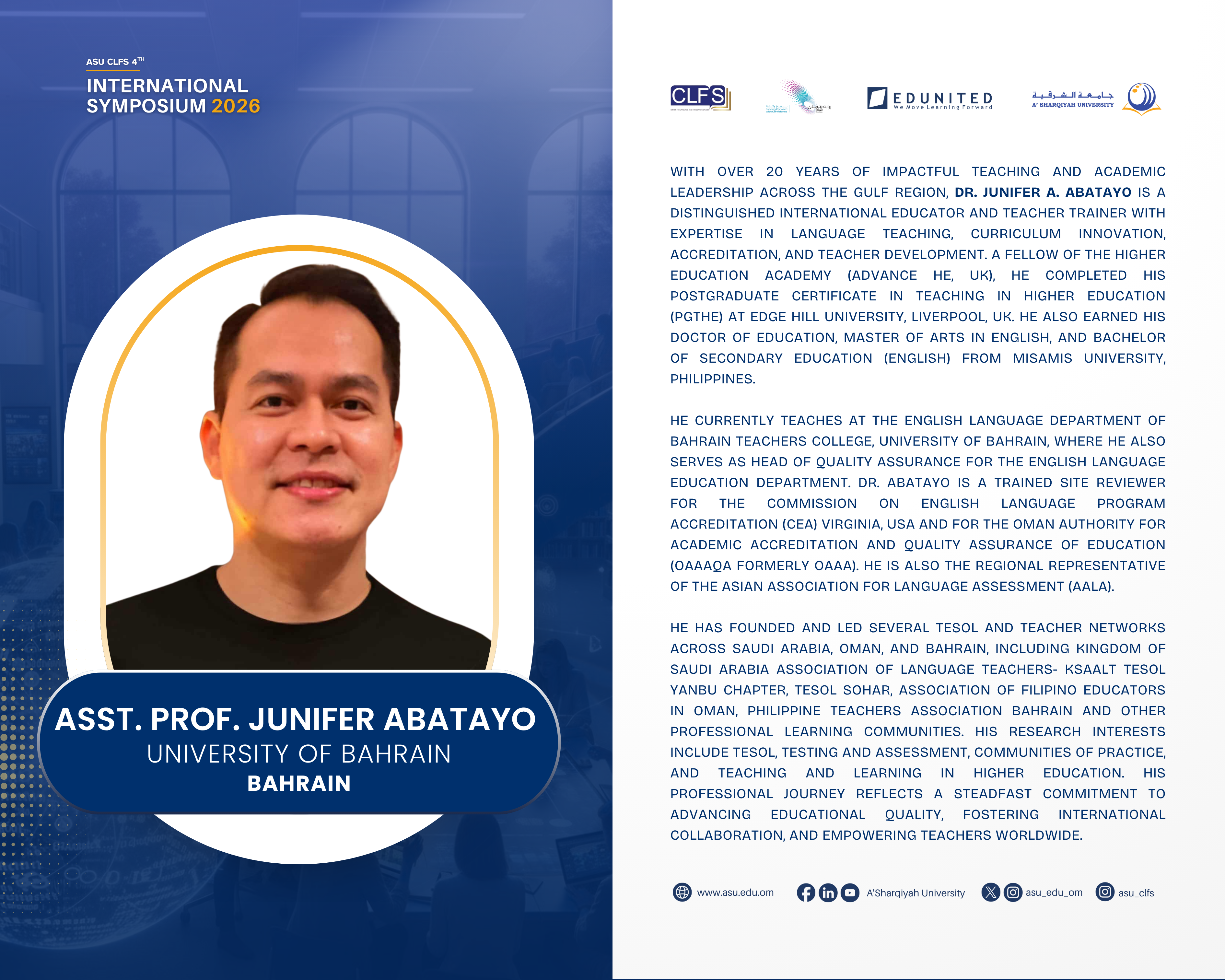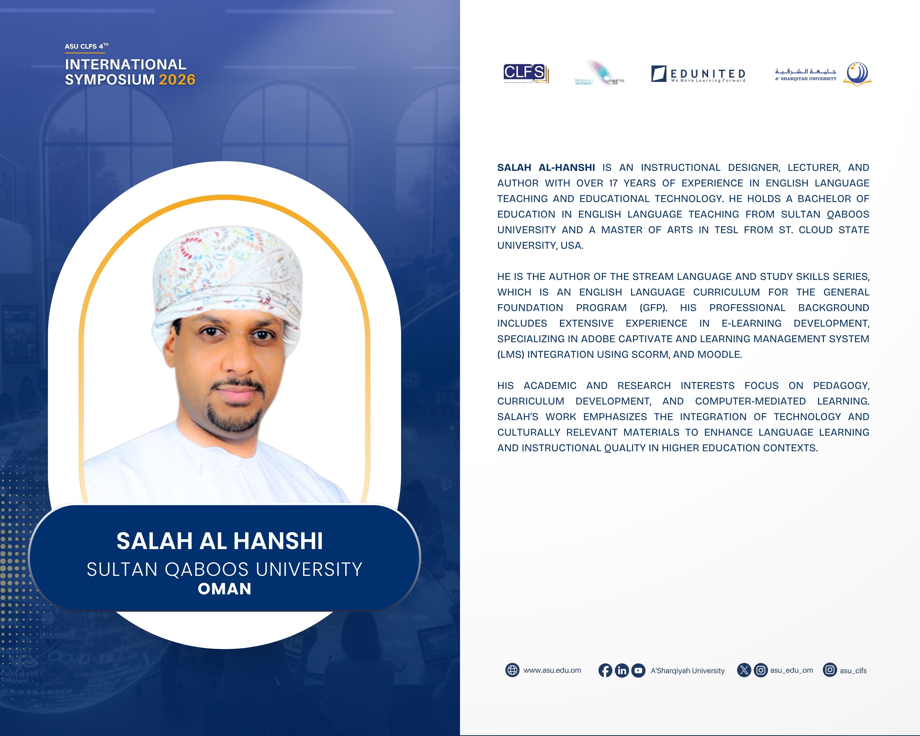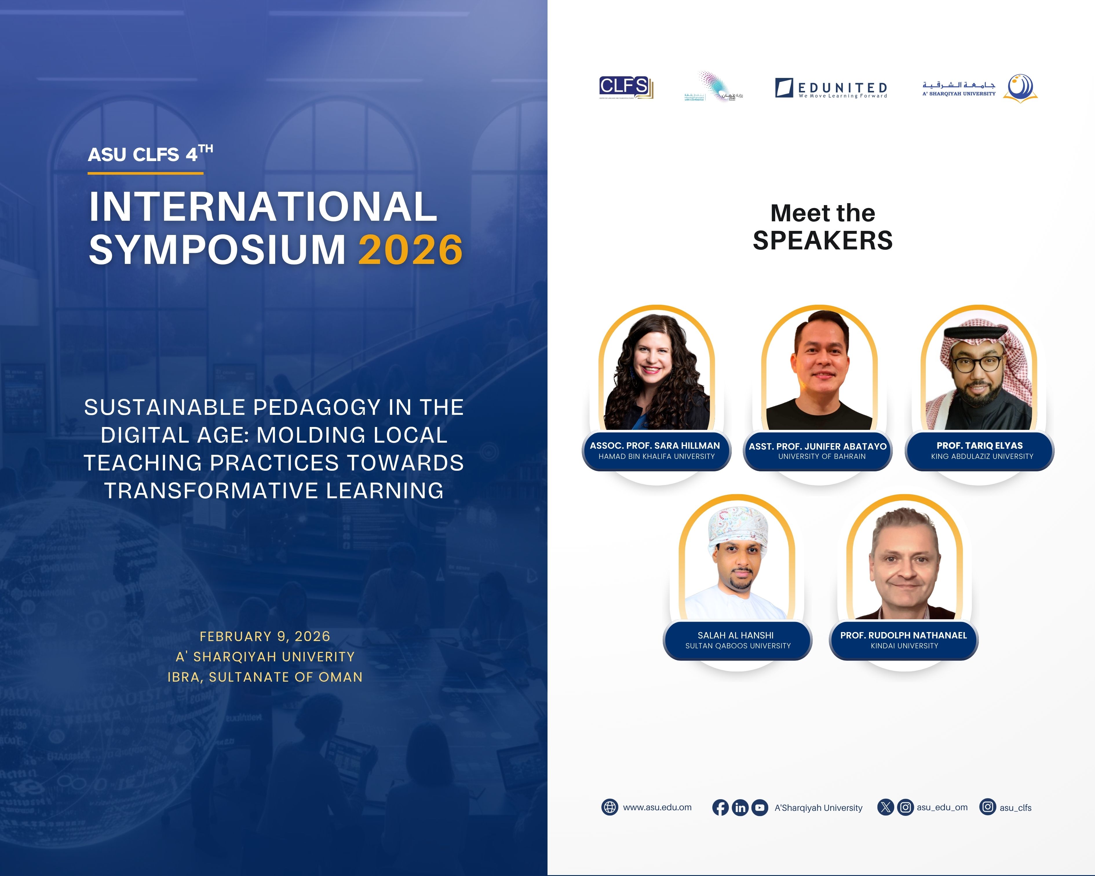 We are pleased to announce the 4th ASU CLFS International Symposium, which will be held at the A' Sharqiyah University on February 9, 2026. Organized by the Center for Languages and Foundation Studies (CLFS) at A’Sharqiyah University (ASU) in Ibra, this international symposium gathers members of the academic community and industry experts to explore local, innovative, and sustainable teaching approaches in Foundation studies in Oman. It aims to review, update, and capacitate Foundation teachers towards alignment with the OAAAQAE; and fulfillment of Learning, Scientific Research, and National Capabilities as a National Priority of the Oman Vision 2040. The event hosts interactive presentations and an open forum that highlight current research, digital trends, and best practices that enhance both students’ and teachers’ transformative learning experiences. It specifically targets discourse on student motivation, curriculum development, assessment materials, quality assurance, and teachers’ professional development in all the four Foundation programs of English, I.T., Mathematics, and Study Skills. Through collaborative discussions, knowledge-sharing, and professional networking, participants will update and develop new teaching practices and even administrative decisions, towards establishing transformative learning as a key contributor to Oman Vision 2040.